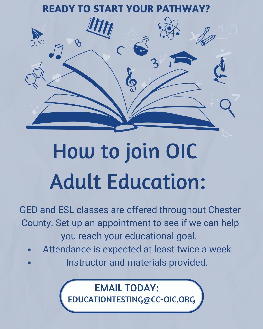 The Chester County Opportunities Industrialization Center (CC-OIC) partners with the Chester County Library, Exton Branch to provide FREE one-on-one tutoring for adult learners (18+) who would like help with: