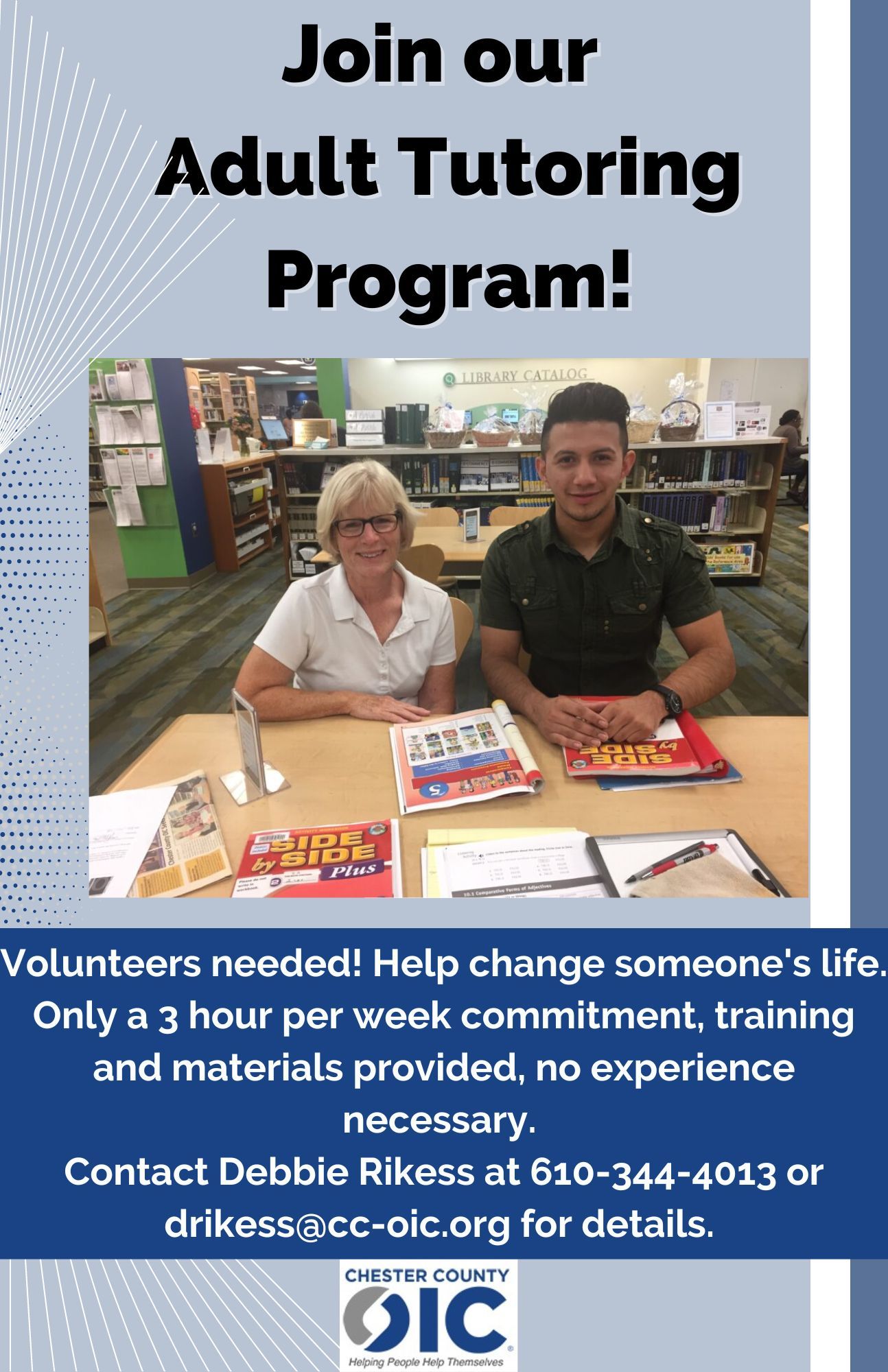 The only requirement to becoming a tutor is a High School degree, teaching experience is not needed. Tutor Training is now offered online through the PA Department of Education. We also offer additional training throughout the year at the Chester County Library. Tutors are asked to meet with their students 3 hours per week, usually in two sessions of 1 ½ hours. If you would like more information, please contact Debbie Rikess at 610-344-4013 or at drikess@cc-oic.org.