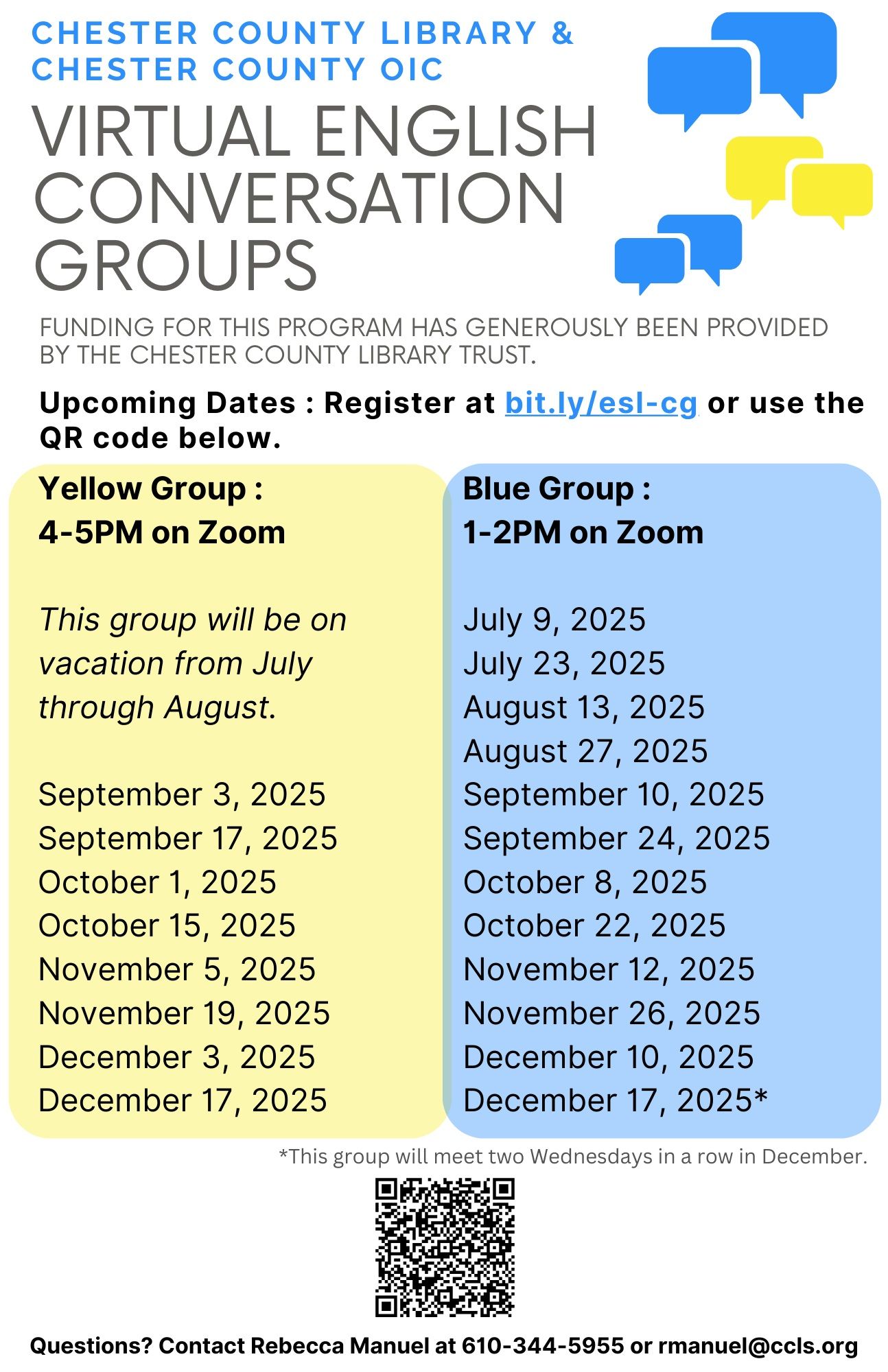 In partnership with the Chester County Library in Exton, the Adult Tutoring program hosts English Conversation groups via Zoom. Both daytime and evening groups are offered. Please review the schedule for dates and times. Registration is required. To register use the QR code on the flyer to learn more. A zoom link will be emailed to registrants 2 hours before the group starts.