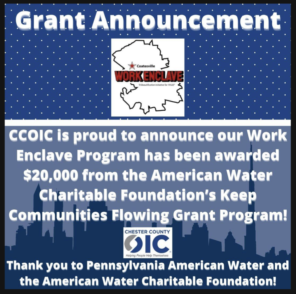 CCOIC is proud to announce our Work Enclave Program has been awarded $20,000 from the American Water Charitable Foundation’s Keep Communities Flowing Grant Program!Thank you to Pennsylvania American Water and the American Water Charitable Foundation!