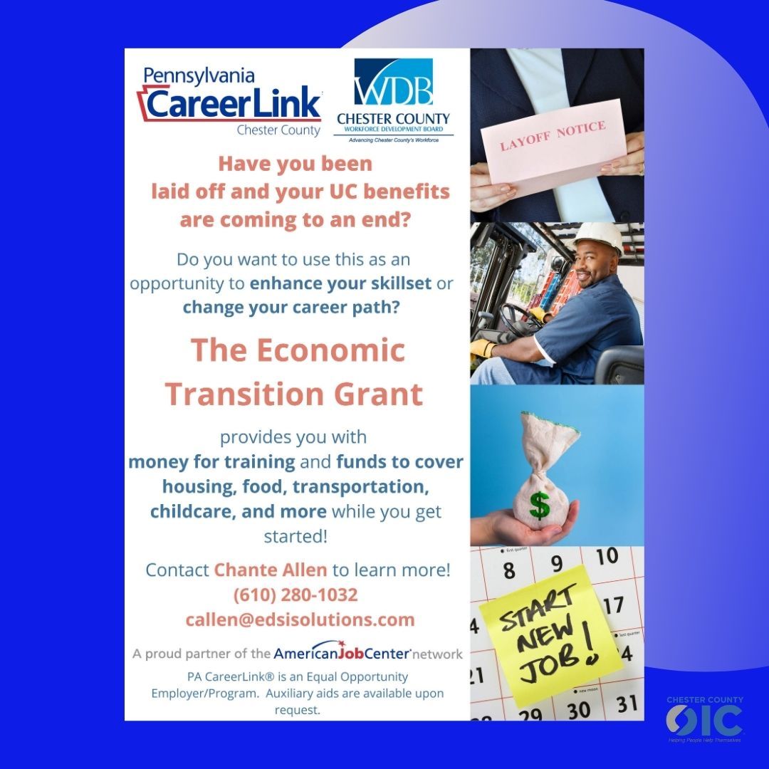 If you have been laid off, the Economic Transition Grant might help you. It provides money for training and funds to cover housing, food, transportation, childcare, and more. For more information, contact Chante Allen at (610) 280-1032 or callen@edsisolutions.com.