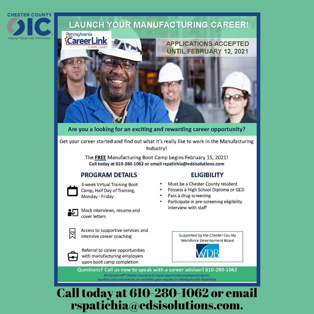 The PA Career Link is hosting a 3-week Virtual Manufacturing Training Boot Camp starting on February 15, 2021 to prepare individuals to gain and retain employment in the Manufacturing Industry. Applications accepted until February 12th. Call today at 610-280-1062 or email rspatichia@edsisolutions.com.