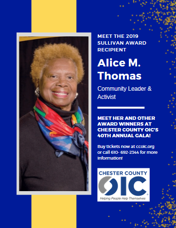 Community Leader and Activist Alice Thomas will be attending our 40th Annual Gala to receive the 2019 Leon H. Sullivan Award! Meet her and other winners on November 15, 2019 at the Desmond Hotel in Malvern as we celebrate those who work with us to help people help themselves. Tickets can be purchased through our website with more information being available by calling 610-692-2344. We hope to see you there!