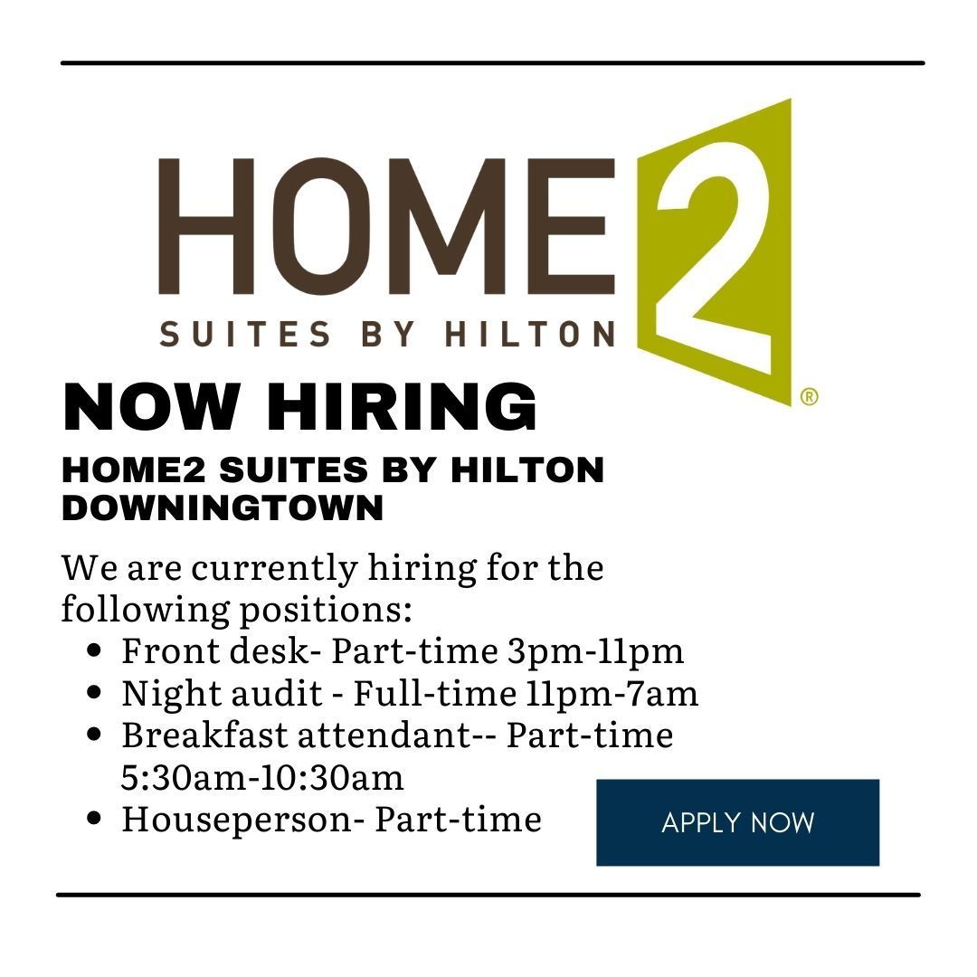 The Home2 Downingtown seeks energetic, passionate individuals to join our team. Proudly affiliated with Gulph Creek Hotels, we seek individuals who are passionately friendly with a high service standard to exceed the expectations of our guests. A strong work ethic and possess a tremendous amount of pride in providing great service is essential to be successful in this position.